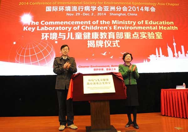 參會嘉賓有:環(huán)境與兒童健康重點實驗室主任張軍主持,國際環(huán)境流行病學亞洲分會主席、國立成功大學教授郭浩然(Hoe-Ran Guo),上海市衛(wèi)生和計劃生育委員會黨委書記黃紅,上海交通大學科學技術發(fā)展研究院常務副院長關新平,環(huán)境與兒童健康重點實驗室前任主任、我國著名兒科學專家、美國醫(yī)學科學院外籍院士沈曉明教授、、、開幕式上還舉行了環(huán)境與兒童健康教育部重點實驗室揭牌儀式,黃紅書記和關新平副院長為重點實驗室揭牌。環(huán)境與兒童健康重點實驗室于2010年底由教育部科技司立項作為重點實驗室進行建設,并于2014年4月通過驗收。